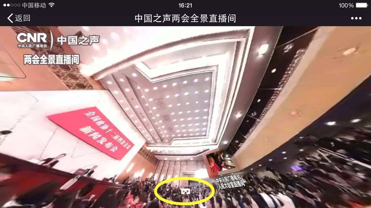 以中国之声为例,这次中国之声采用的全景报道突出了交互体验。在会议过程中,观众不仅可以随时转换视角,甚至还可以跳换视点,上一秒还在记者的旁边,看她起身提问题,下一秒就可以点进场边的中国之声直播席,在身边看看主持人和导播是怎么完成一次直播的。如果点击下图黄圈中的按钮、并将手机放入VR眼镜,那么就能看到立体的直播了。